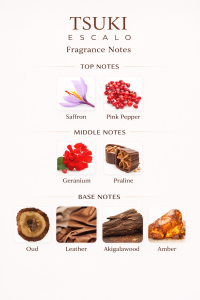 TSUKI by E S C A L O is a rich extrait de parfum blending spicy saffron and pink pepper with sweet praline and geranium, finishing with a deep base of oud, leather, akigalawood and amber.